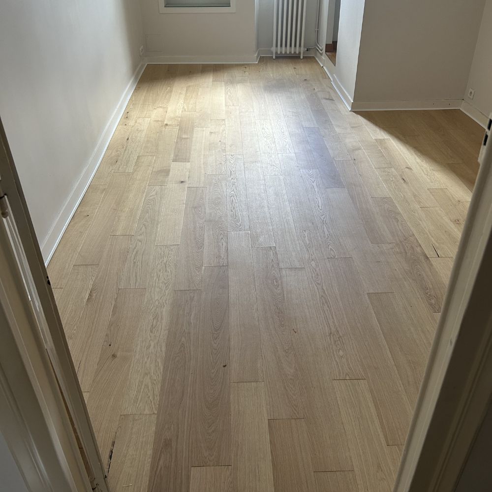 Sur ce chantier, nous avons réalisé le changement d'une moquette par un parquet flottant. La moquette était posée sur un parquet existant. Donc, nous avons procédé à l'arrachage de la moquette pour ensuite poser un primaire spécial parquet afin de durcir le parquet puis de boucher les rainures. Après 12 heures de séchage, nous avons coulé un ragréage fibré. Enfin, nous avons posé le parquet flottant.