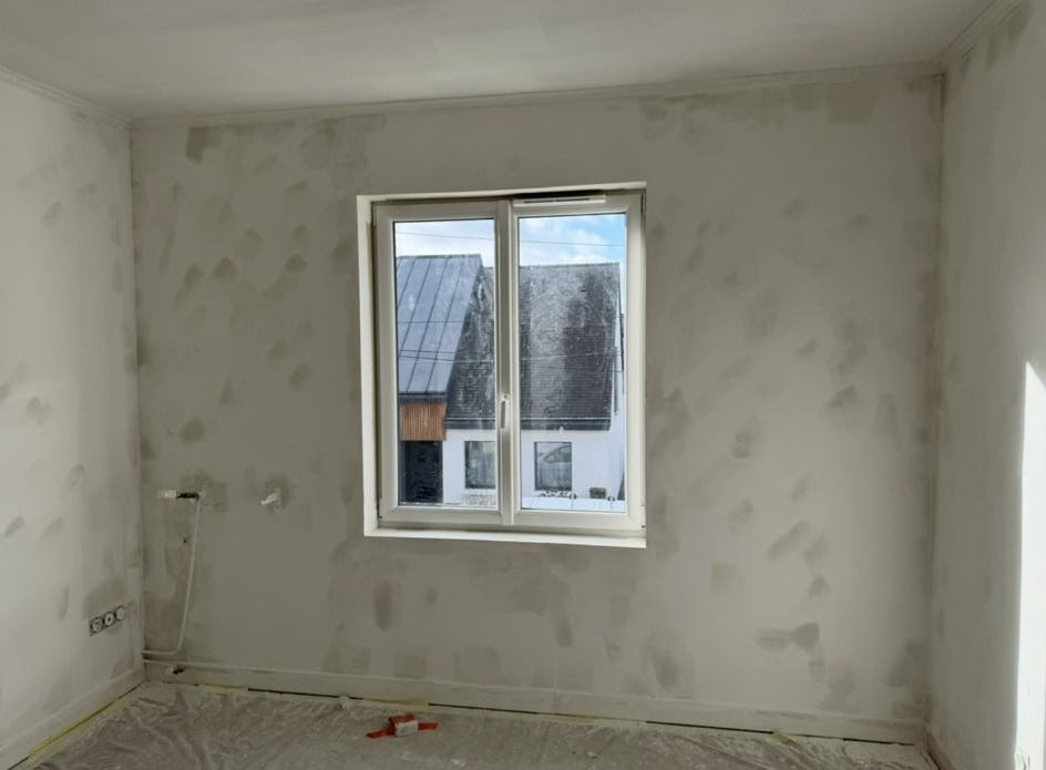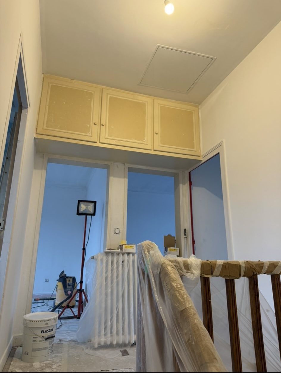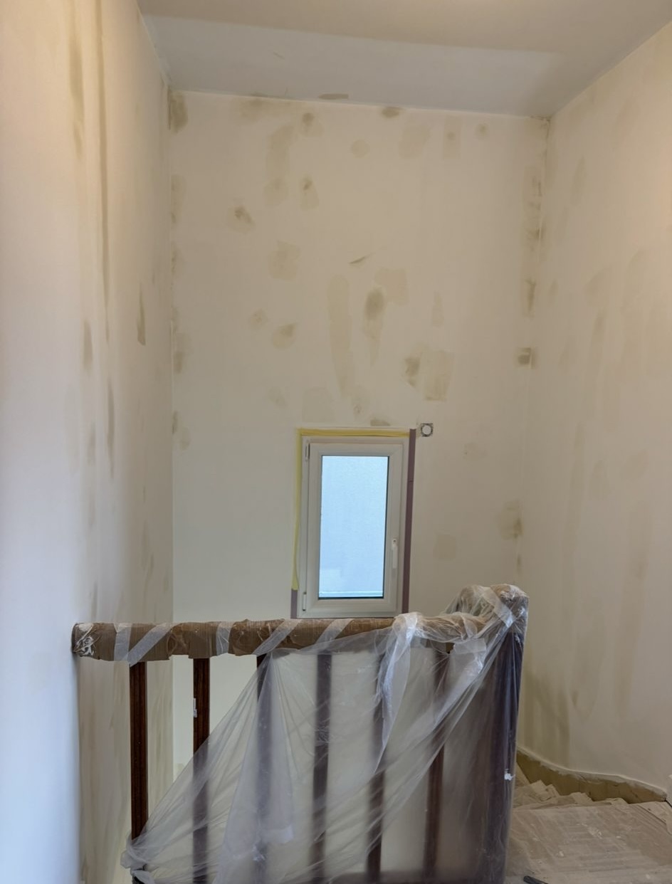 Nous avons réalisé le tapissage et le ratissage complet de l’ensemble des murs en deux, voire trois couches pour une finition parfaitement lisse. Les plafonds ont été remis en peinture avec une finition soignée. Les murs ont reçu une peinture velours pour un rendu élégant et durable. Enfin, les boiseries ont été traitées et peintes en glycérol blanc pour une finition nette et résistante.