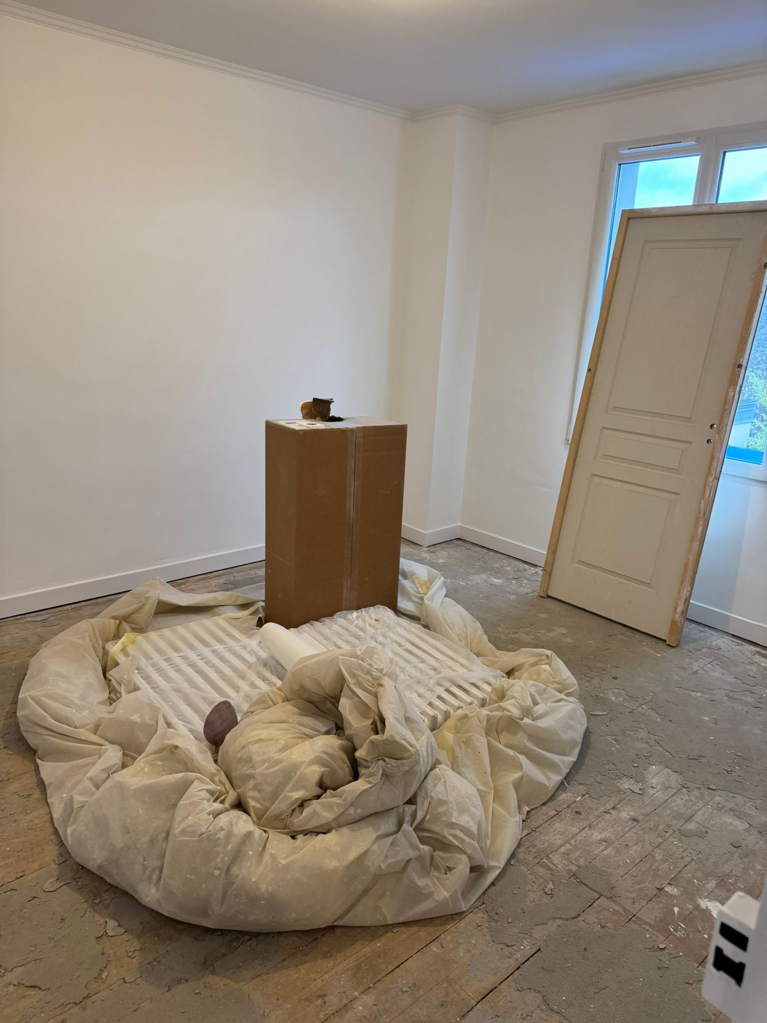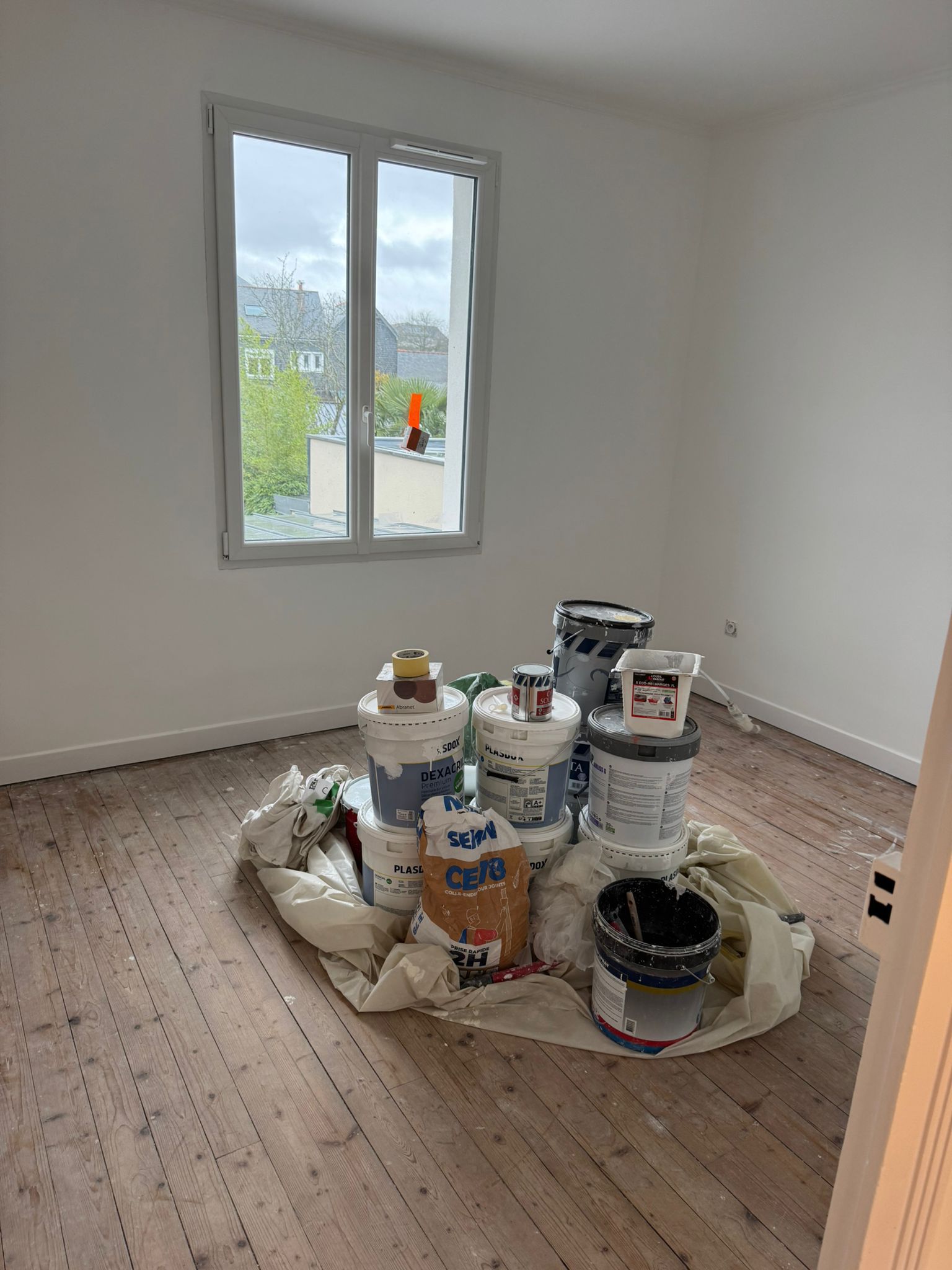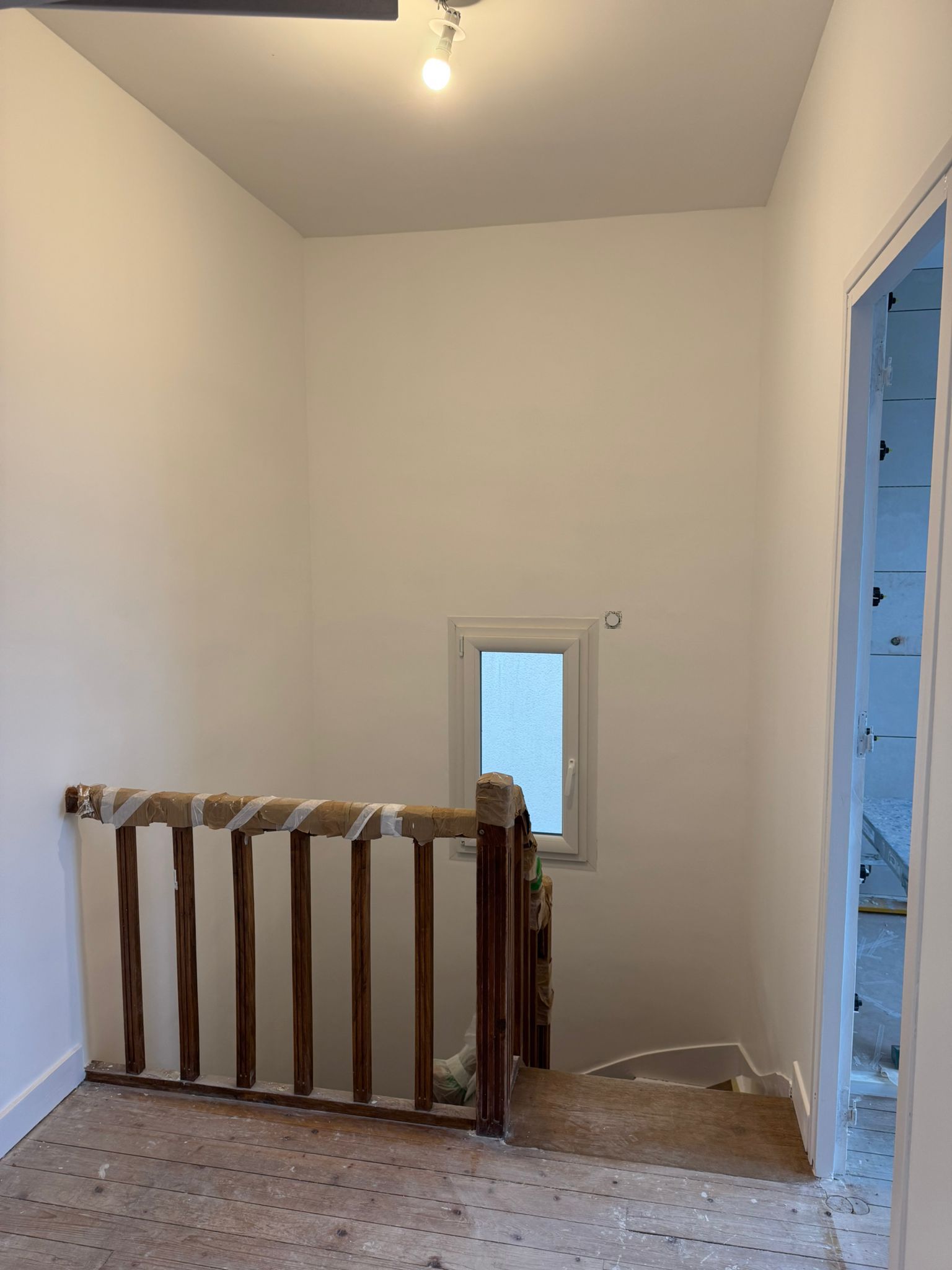 Nous avons réalisé le tapissage et le ratissage complet de l’ensemble des murs en deux, voire trois couches pour une finition parfaitement lisse. Les plafonds ont été remis en peinture avec une finition soignée. Les murs ont reçu une peinture velours pour un rendu élégant et durable. Enfin, les boiseries ont été traitées et peintes en glycérol blanc pour une finition nette et résistante.