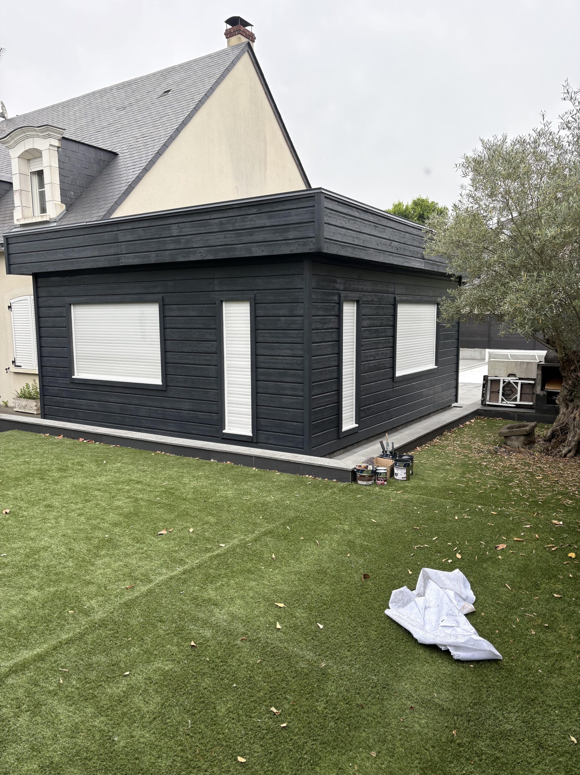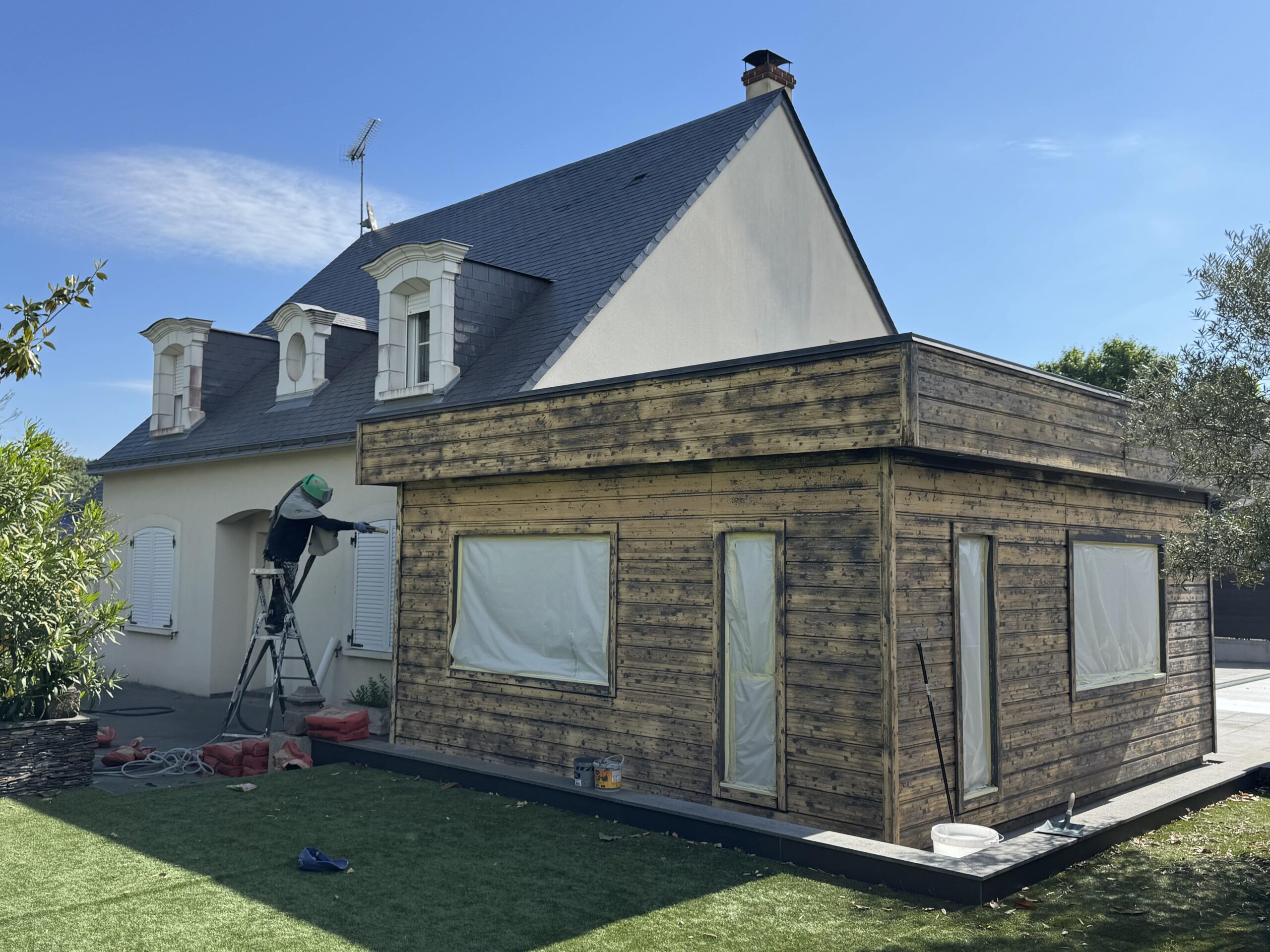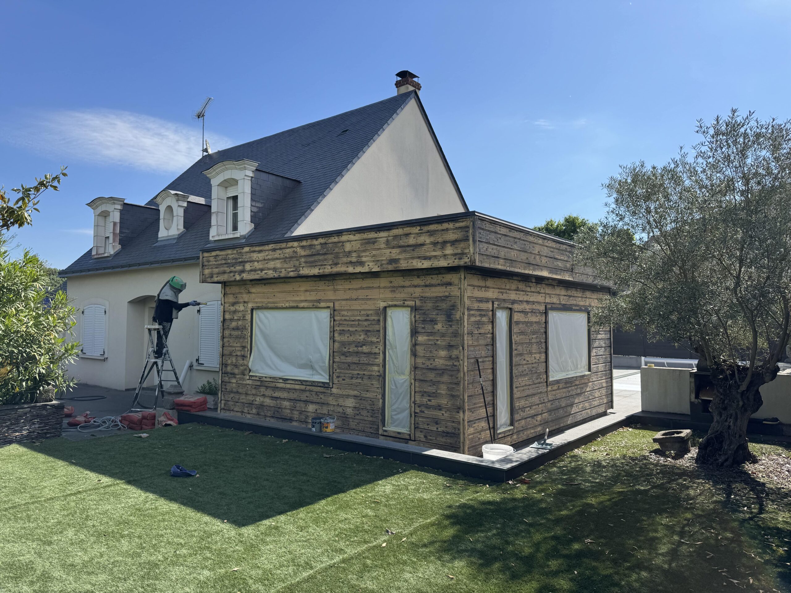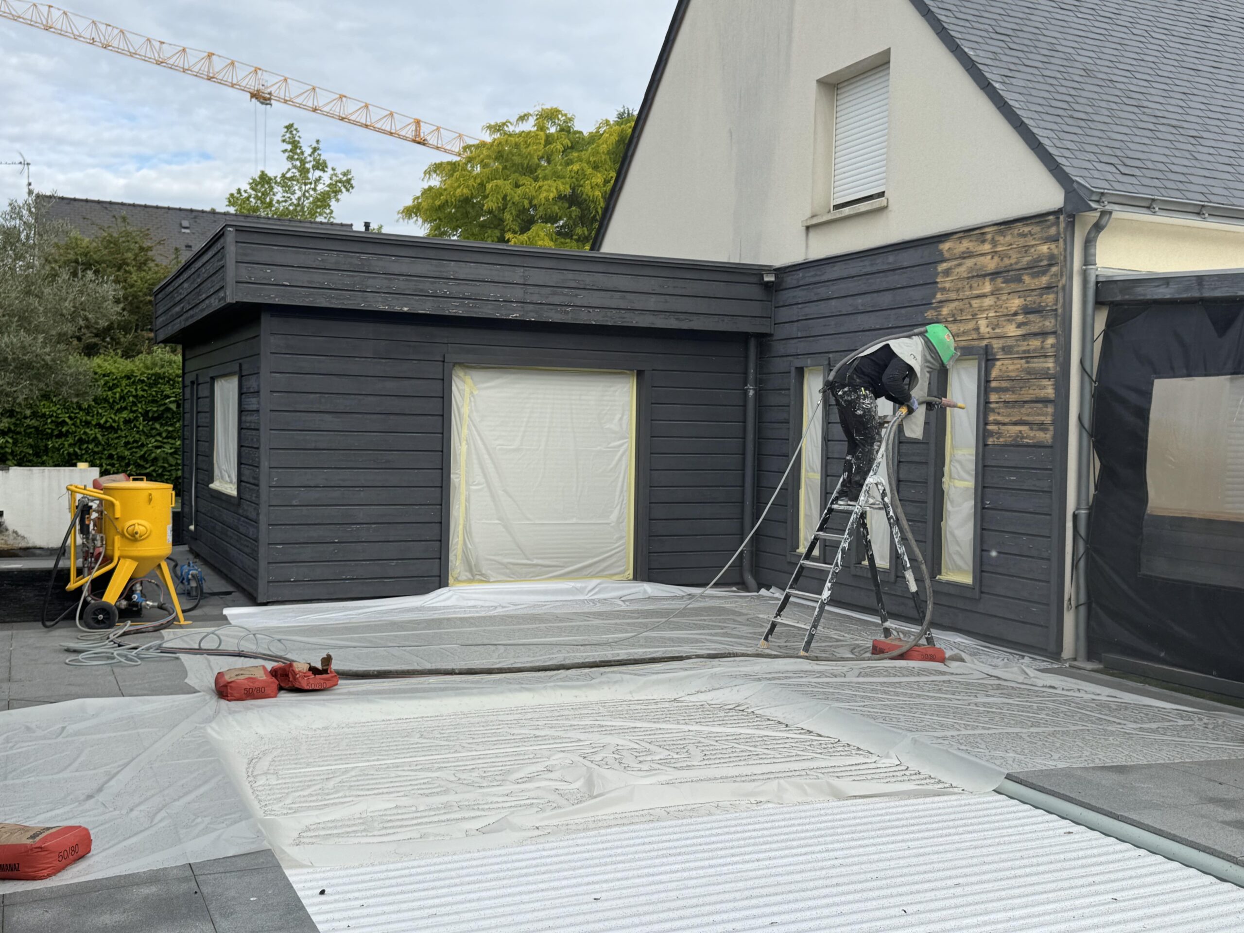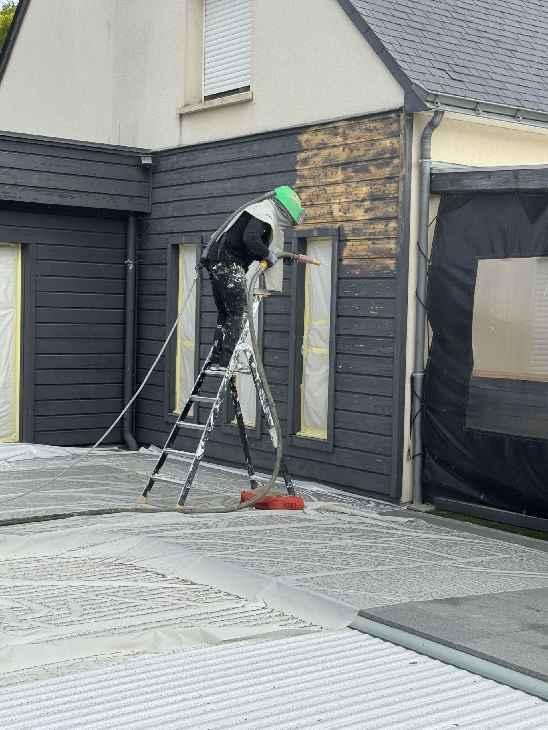 Dernièrement, nous avons mené à bien un chantier de rénovation d’une façade en bois situé sur Angers. L’objectif était de redonner tout son cachet à la façade, tout en assurant une protection durable. On a commencé par un aérogommage soigneux, pour retirer entièrement les anciennes couches de peinture sans agresser le bois. Une fois la surface bien nettoyée, un ponçage complet a été réalisé pour garantir une accroche parfaite. Et pour finir, trois couches de peinture ont été appliquées avec soin, afin d’assurer un rendu esthétique et une tenue dans le temps. Une belle transformation qui redonne fière allure à cette façade !